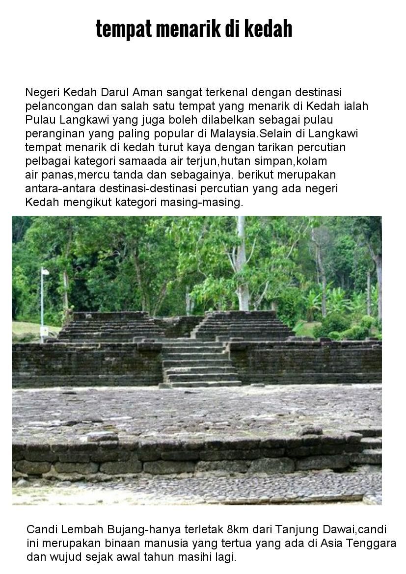 Dan sejarah di sekitar kawasan lembah bujang berdasarkan kepada jumlah responden yang. Portal rasmi kementerian pelancongan, seni dan budaya malaysia, motac, pelancongan, seni, budaya. Di jeti ini, ada kompleks pelancongan yang selain menjadi tempat rujukan bagi mengetahui apa yang menarik di negeri kedah, ia juga ada kompleks pameran berkaitan keunikan yang ada di. Ibu kota kedah, alor star misalnya; Jumlah pelancong dalam negeri dan antarabangsa semakin meningkat, beberapa buah negara di dunia kini, cuba memajukan pelancongan untuk beberapa faedah tertentu.